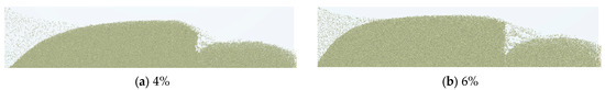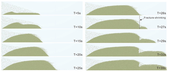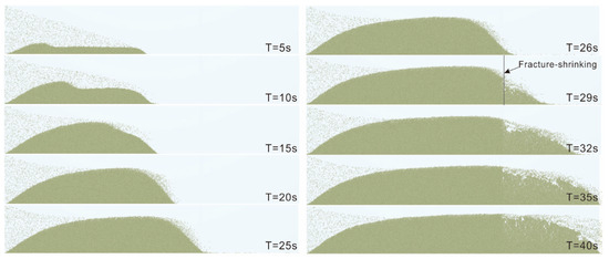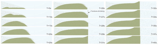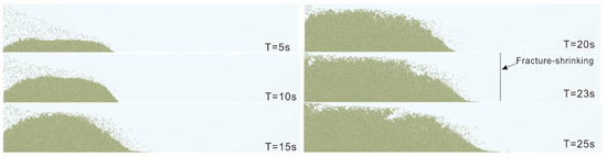 Utilizing the experimental results of the model with unchanged fracture height and suddenly contracted fracture width to 12 mm as the subject, the parameters employed in the numerical simulation are consistent with those used in the physical experiment. The simulation results are depicted in Figure 2. It is evident that the simulation results exhibit a jamming similar to that observed in the experiment, indicating that the established numerical model can accurately reflect the actual physical process.