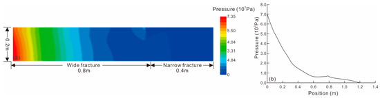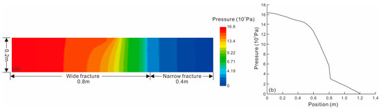 Pressure distribution due to the accumulation of particles. (a) Fluid pressure drop in the fracture, (b) pressure curve along the middle section of the model (sealing mode 2).