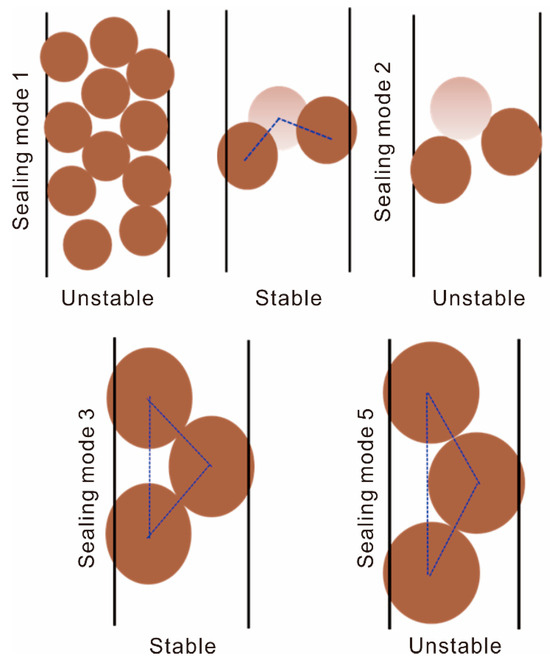Figure 11 shows the local sealing structure of particles corresponding to different sealing modes. Figure 11a shows the typical filling behavior of mode 1, where no local bridging structure is formed in the main fracture due to the presence of small particles. The particle size to narrow fracture width ratio at the neck is 0.4, which prevents effective bridging structure formation during fracture contraction and allows for easier flow into a narrow fracture. However, this flow cannot achieve three particles flowing side by side in the same plane and will be hindered, resulting in the uneven filling of the local regulator. Figure 11b illustrates sealing mode 2, which also lacks a localized bridging structure in the main fracture. The ratio of particle size to narrow fracture width is 0.5, resulting in the formation of a bridge structure with a certain degree of stability at the crack neck, impeding the flow of particles. However, due to the relatively large width of the narrow fracture, its structural stability is insufficient, resulting in a lower sealing height and only local sealing being achieved. Figure 11c depicts the complete sealing of mode 3. It is evident that no local bridging structure forms in the main fracture due to small particles. Nevertheless, at neck shrinkage, where the ratio of particle size to narrow fracture width is 0.66, an effective bridging structure forms and remains relatively stable even under fluid erosion. Figure 11d demonstrates sealing mode 4, which forms a localized bridging structure in the main fracture due to the ratio of particle size to the width of the main fracture, leading to uneven filling of regulator particles and resulting in local jamming.