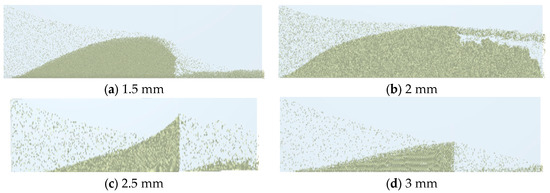Firstly, it is important to note that due to the consistent concentration of particle volume, the quantity of particles injected into the fracture simultaneously by larger particle sizes is relatively lower compared to smaller particles. Therefore, we analyze the sealing effect not based on particle accumulation form but rather on the sealing condition at the shrinkage joint. Simulation results indicate that as the modulator’s particle size gradually increases, its blocking effect improves (Figure 13). Nevertheless, 3 mm particles exhibit a weaker blocking effect than 2.5 mm particles. Preliminary analysis suggests that this may be attributed to the large size of 3 mm particles, which hinders the effective formation of a “bridge” between them and the wall at the shrinkage joint, thus preventing local stable structure formation and allowing most of them to pass through.