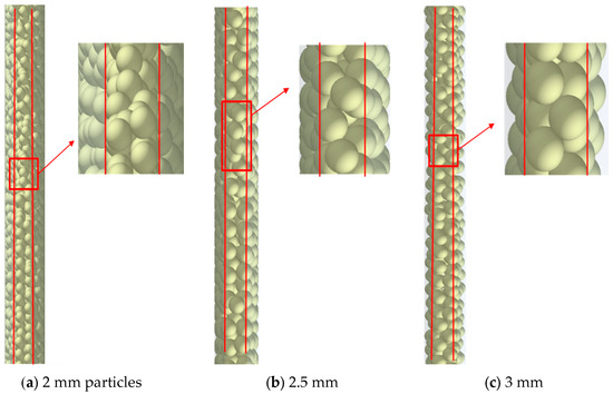 The cause of this phenomenon can be elucidated by analyzing the local sealing structure (Figure 14). It is evident that when the particle size is small (2 mm), the particles only form a localized bridge and do not establish a stable structure on the fracture width, resulting in poor sealing effectiveness. As the particle size gradually increases to 2.5 mm, it forms a more stable bridging structure at the joint and avoids destruction, leading to better sealing performance of prticles. However, as particle size continues to increase (3 mm), since a single particle occupies almost the entire width of the fracture, its bridging structure with other particles and walls becomes extremely unstable and difficult to form effectively, thus resulting in a poor blocking effect.