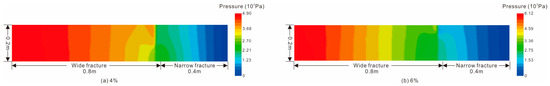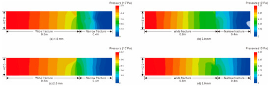 Figure 6 illustrates the pressure distribution, indicating that the accumulation of particles results in a significant pressure drop within the fracture due to increased resistance of fluid flowing through the particles. Since no particle accumulation occurs at the half height of the fracture in the flow regulator, pressure drop primarily occurs due to the necking effect. The flow resistance is essentially equivalent to that in the wide fracture, resulting in uniform pressure throughout and no significant sealing.