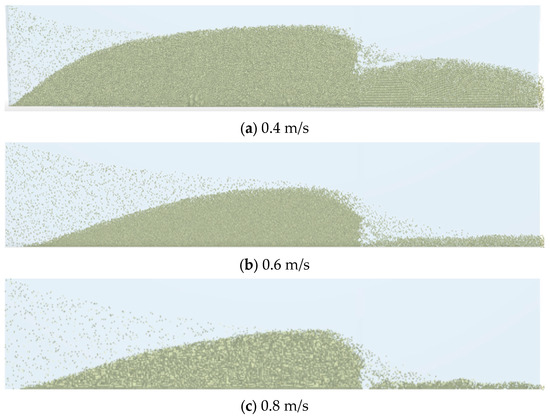 The main manifestation for Group 1 is the second mode of local jamming. Through simulation results at various injection velocities, it can be observed that an increase in velocity leads to a deteriorating blocking effect of the flow regulator (Figure 20). This phenomenon arises due to the high shear forces generated by larger particles, which disrupts the stable structure formed between the regulator and wall at the contraction joint, consequently causing more regulator particles to advance.