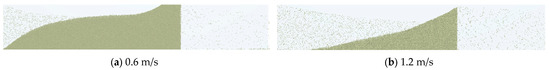 For Group 2, sealing mode 3 of complete sealing is predominant (Figure 21). The simulation results demonstrate that regulator particles can achieve full jamming in the fracture at a low velocity of 0.6 m/s, whereas an increase in velocity to 1.2 m/s fails to attain complete sealing due to insufficient fracture height.