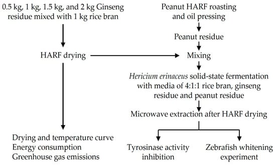 The experimental design diagram (Figure 2) was separated into two parts. First, the drying rate and energy consumption of HARF drying ginseng residue and rice bran combinations were assessed. The HARF-treated rice bran, ginseng residue mixture, and peanut residue after oil extraction were mixed in a 4:1:1 ratio (45% moisture content) to make a solid-state fermented medium. The water extracts from 5-week Hericium erinaceus solid-state fermented products were analyzed for the whitening effect.