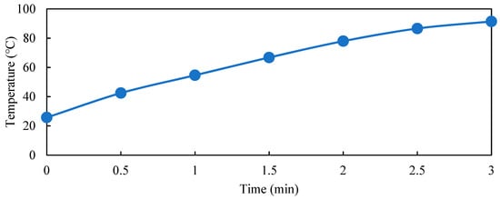 Rice bran, containing lipase and lipoxygenase, increases the risk of lipid degradation and rancidity. Therefore, heat stabilization is essential for preventing rancidity in the oils []. In this study, a 5 kW HARF system was used to heat 1 kg of rice bran for 3 min. As a result, the surface temperature increased from 25 °C to over 90 °C, while the interior temperature exceeded 100 °C, resulting in the deactivation of enzymes present in rice bran (Figure 3). The activity of lipase in rice bran was quickly inhibited during the RF heating process []. Moreover, the moisture content of rice bran decreased from 14% to 4%.