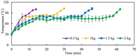 The 1 kg rice bran mixed with varying loads of wet ginseng residue (0.5, 1, 1.5, and 2 kg) exhibited different moisture contents of 31.67%, 45%, 53, and 58.33%, respectively. As a result, they possessed different loading weights of 1.5, 2, 2.5, and 3 kg for HARF drying. Figure 5 shows that temperatures quickly rose from 30 °C to 80 °C during the initial drying phases. At this time, sensible heat was provided, and then the temperature slowed down and became flat around 75~80 °C due to the conversion of energy into latent heat required for water evaporation and with 100 °C hot air to remove water vapor. Finally, the temperature of the samples reached 100 °C. Therefore, HARF could prevent microbial growth in wet ginseng residues from producing sour and spoiled odors due to a low temperature and long drying duration of only 45 °C cold air drying for 900 min.