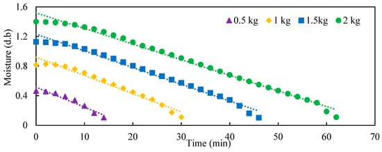 Figure 6 shows that the rate of decrease in moisture content (dry basis, g water/g dry material) was rather slow during the first 5 min due to the conversion of RF energy into sensible heat within the sample. Following this phase, a linear and constant rate drying period was observed. Notably, the rates of moisture content reduction were similar for all four samples. In the linear regression analysis of the drying curve, the drying rates for the mixtures of 1 kg of rice bran with 0.5, 1, 1.5, and 2 kg of ginseng residue ranged from approximately 26.2 to 27.4 g water/min (as shown in Table 1). HARF drying was effective, and the drying time was proportional to the sample loading.