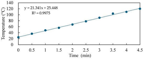 Before the extraction of peanut oil, peanuts were roasted at high temperatures to deactivate enzymes, reduce moisture content, create a distinctive flavor, and increase oil extraction efficiency []. Figure 7 shows the center temperature curves of 1 kg of peanuts during 4.5 min HARF (100 °C hot air-assisted 5 kW radio frequency with a 12 cm electrode gap). The final center temperature of peanuts increased in proportion to the heating duration, 120 °C, respectively. Evidently, the heating rate of the center temperature of peanuts was 21.341 °C /min. The roasted peanuts were then wrapped in parchment paper before being loaded into the oil press. Oil pressing was performed at 45 °C, and the oil yield was 39.52 ± 0.46%, while peanut residue accounted for about 60% of the initial peanut weight.