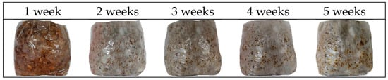 According to a prior study, agricultural byproducts of rice bran and wet ginseng residue in a ratio of 2:3 were dried by HARF to achieve a ratio of rice bran to ginseng residue of 4:1, with the addition of peanut residue after oil expression. As a result, the 500 g solid-state media consisted of rice bran, ginseng residue, and peanut residue in a 4:1:1 ratio, with 45% moisture content in a bag. Sterilization and cooling were carried out, followed by a 5-week solid-state fermentation of Hericium erinaceus at 25 °C. Figure 8 shows that the mycelium of Hericium erinaceus grew in the bag from 1 to 5 weeks. In the second week, the white mycelium was noticeable, progressing to the appearance of mycelium during weeks 3 to 4. Over time, the mycelium gradually filled the bag.
