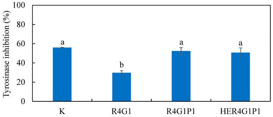 Effect of 100 µg/mL of water extracts in different concentrations on inhibition of tyrosinase activity. K: kojic acid; R4G1: water extracts from rice bran mixed with ginseng residues in a ratio of 4:1; R4G1P1: water extracts from the mixture of rice bran, ginseng residues, and peanut residue in a ratio of 4:1:1; HER4G1P1: water extracts from Hericium erinaceus solid-state fermented rice bran, ginseng residues, and peanut residue in a ratio of 4:1:1 product. Data are expressed as mean ± S.D. (n = 3). a,b Means with different letters in the samples indicate significant differences (p < 0.05).