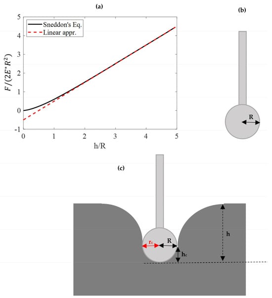 Deep spherical indentations (h > R). (a) The data when using Equations (2)–(5) in the domain 0 < h/R < 5 and the linear behavior for big h/R ratios (Equation (7)). It can be assumed that the Young’s modulus can be accurately calculated by fitting the linear segment of the curve to Equation (7). (b) A spherical indenter which permits very deep indentations. A typical example is the biosphere B150-FM (nanotools) obtained by NanoAndMore. (c) A deep spherical indentation (h >> R). In this case, the contact radius is nearly identical to the tip radius (i.e., ).