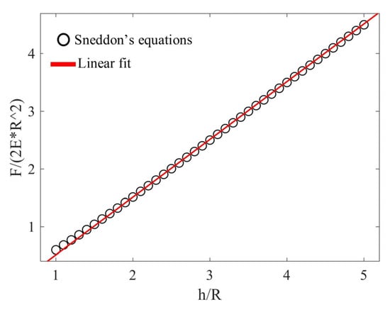 In Equation (10), and . The linear fit was accurate since the R-squared coefficient was close to 1 (). This result is consistent with the case of big h/R ratios, since, in this case, the force–indentation curve tends to be linear as already mentioned (see