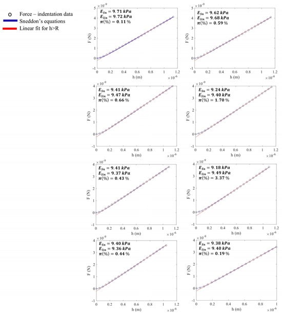 The data were first fitted to Equations (2) and (3) in the domain 0 ≤ h ≤ hmax. Subsequently, linear fitting was also performed on the data for h > R = 150 nm. The Young’s modulus values, calculated using Sneddon’s Equations (2) and (3), as well as the linear approximation (Equation (9)), are presented for comparison in eight characteristic curves (Figure 3). The percentage differences in Young’s modulus calculations are also shown. The differences are small in any case.