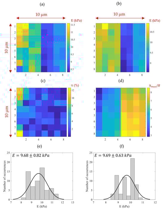 Young’s modulus maps and statistics (data obtained on lung tissues from mice). (a) An 8 × 8 Young’s modulus map. The data were processed using Sneddon’s equations (area: 10 μm × 10 μm). (b) The same data processed using the linear approximation (Equation (9)). (c) The percentage differences between the results presented in (a,b). (d) The ratios for the measurements in (a,b). For small ratios, the error increases as shown in (c). (e,f) The Young’s modulus distributions and Gaussian fits for the measurements shown in figures (a) and (b), respectively.