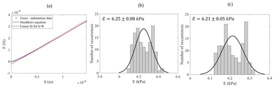 A linear fit was applied to the upper 50% of the force–indentation data (i.e., experimental data) presented in Figure 5a. The resulting Young’s modulus was 6.35 kPa. There is a small difference compared to the result derived using a linear fit for h > R (i.e., 6.30 kPa), as the fitting process is affected by the data points used.