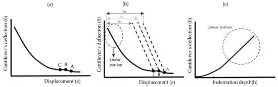 where represents the cantilever’s deflection at the contact point. In addition, the indentation depth (h) is defined as the difference between the displacement of the sample of interest (z) (which represents the soft sample’s displacement towards the AFM tip) and the displacement of a hard material unaffected by the indenter. The displacement of the hard material is equivalent to the deflection of the cantilever under the same applied force (Figure 6b,c) [,,].
