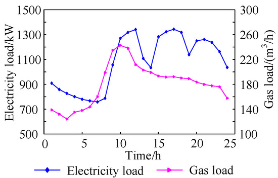 In this study, the capacities of WT, MT, PV, ES, GS, P2G and CC in the IEGES are the variables, and the cost parameters of each type of equipment are obtained from references [27,28]. The relevant operating parameters are shown in Table 1. The annual wind speed, solar intensity as well as the electricity and gas loads on a typical day are derived from the actual operation data from Hebei Province, China, which are shown in Figure 2 and Figure 3. Moreover, the K-means clustering method is adopted to reduce the computational complexity of the planning problem by clustering the 8760 h time-series curves into several typical daily curves. Specifically, the power output curves and the corresponding probability of the typical scenario are shown in Figure 4 (taking electricity load as an example). Note that in this study, we set the number of clusters to 4, and it is clear that the different clusters of electric load curves have similar shapes (which are determined by the inherent electricity consumption behavior), but differ significantly in their magnitude, e.g., the peak load of cluster 1 is nearly three times greater than that of cluster 4.