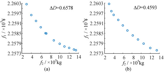 - Solving the optimal problem defined by Equation (33) to obtain the final ε.where denotes the uniformity index of the Pareto frontier, dj is the Euclidean distance between two neighboring points in set (f2*, f1*), dave is the average value and Np is the number of point pairs in set (f2*, f1*). dL and dD are the Euclidean distances between the left and right endpoints of the obtained point set and the corresponding left and right ideal points, respectively. , and , are the upper and lower limits of the objectives f1 and f2, respectively.