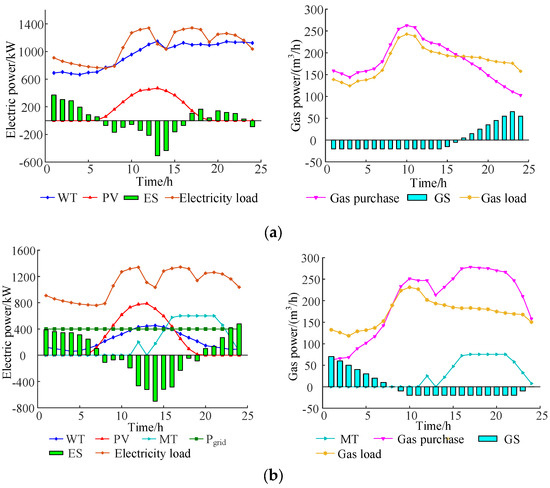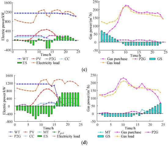 Based on the wind power, solar power, electric load and gas load data, the optimized power outputs of IEGES under different typical days are shown in Figure 6. Taking scenario 4 as an example, we can find that during the 00:00~15:00 time period, the WT and PV outputs are greater than the electric load, and the surplus power in this period is balanced by ES, P2G and CC. Specifically, P2G is put into operation to consume wind power in the time period 02:00~04:00 and the time period 11:00~15:00; correspondingly, P2G generates natural gas in these time periods, which facilitates the consumption of wind power. Similarly, CC is put into operation in the 11:00~15:00 time period, which improves the utilization of renewable energy. During the time period 19:00~24:00, there is no wind and no solar, the electricity load is balanced by ES and MT and power is purchased from the power grid. For the gas balance, although the gas demand increases at these time periods, the gas purchase does not increase, which is mainly due to the gas storage.