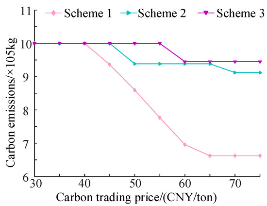 In the simulation in this paper, it is assumed that the carbon trading price αcarb is fixed. In practice, the carbon trading price will fluctuate; thus, the trend of carbon emissions with carbon trading price under different schemes is presented in Figure 7. When the carbon trading price changes in the range of 30~40 CNY/t, the carbon emissions of the three schemes are at the upper limit due to the low penalty cost of carbon emissions. With the rise in carbon trading price, the penalty cost of carbon emissions increases accordingly, and the carbon emissions under scheme 1 are significantly reduced while the carbon emissions for scheme 2 and scheme 3 show a small decrease, which demonstrates that the proposed scheme can reduce carbon emissions effectively.