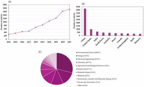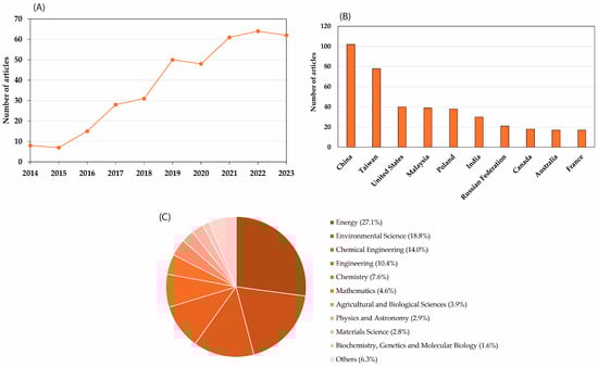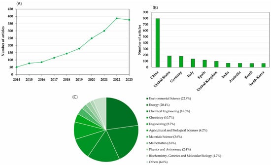 Number of publications of research articles (A), the 10 countries with the most publications of research articles (B), and the main subject areas of the research articles found (C) on biochar from pyrolysis from 2014 to 2023.