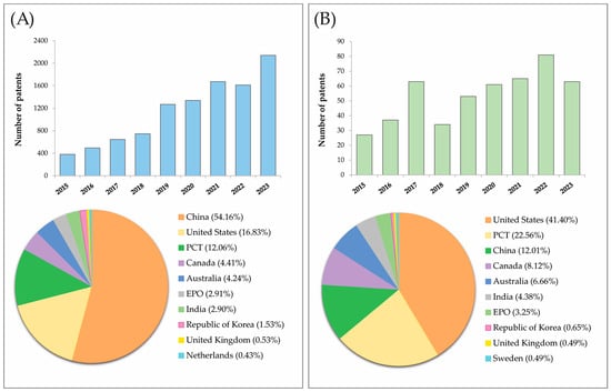 Patent databases represent an attractive and dependable resource for gauging the technological advancement and innovation that companies and universities have developed over the years. Thus, a search using the term “biochar OR bio-char” on the PATENTSCOPE database returned 11,654 patent documents. China (54.16%) and the United States (16.83%) are the countries investing the most in biochar, collectively accounting for almost 71% of the total intellectual property (Figure 5A). These results are in line with what was discussed in Section 3, as both China and the United States are the leading countries in terms of publishing research related to biochar.