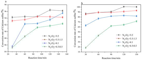 As shown in Figure 2a, at a temperature of 500 °C, the nitrogen–oxygen ratio was 4.5:0.5, and the conversion rate of the calcium sulfite system after 30 min of reaction was greater than 85%. When the nitrogen–oxygen ratio was reduced to 3.5:1.5, the conversion rate of calcium sulfite increased to approximately 93%. Thus, under the same reaction time and temperature, an increase in oxygen concentration resulted in an 8% increase in conversion rate. At a temperature of 400 °C, the increase in oxygen concentration had a greater influence on the conversion rate, resulting in a more pronounced elevation in the curve. As shown in Figure 2b, the oxidation rate of calcium sulfite for 30 min at 400 °C was approximately 16% when the nitrogen–oxygen ratio was 4.5:0.5. Upon reduction of the nitrogen–oxygen ratio to 3.5:1.5, the calcium sulfite conversion rate increased to approximately 85%. The conversion rate of calcium sulfite oxidation of calcium sulfate was increased by approximately 69%. However, as the oxygen concentration continued to increase, that is, the nitrogen-to-oxygen ratio was less than 3.5:1.5, the conversion rate decreased as the oxygen concentration increased.