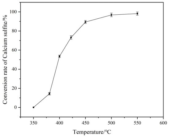 The effect of reaction temperature on CaSO3 oxidation is illustrated in Figure 3. It is evident from the graph that an increase in temperature led to a significant rise in the conversion rate, suggesting that the CaSO3 oxidation reaction adhered to the Arrhenius equation, where higher temperatures accelerate the reaction rate. Below 350 °C, CaSO3 exhibited excellent thermal stability and did not undergo any reaction, maintaining its chemical composition unchanged. As the temperature rose to 380~400 °C, the conversion rate increased rapidly from 0 to 80%, indicating an evident enhancement within this temperature range. At 400~500 °C, the curve exhibits a significantly low slope, indicating a noticeable slowdown in the conversion rate. This observation implies that the conversion reaction had progressed to its later stage, and the active components had been largely consumed, leading to exhaustion. Consequently, CaSO3 is essentially oxidized at temperatures of 550 °C and above.