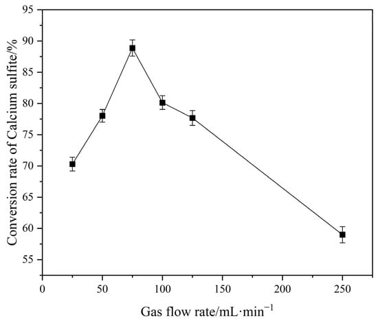 As depicted in Figure 4, the relationship curve between the medium flow rate and CaSO3 conversion rate demonstrates a pattern of first increasing and then decreasing. From the graph, it is evident that when the gas flow rate was below 75 mL·min−1, the CaSO3 oxidation rate increased as the gas flow rate rose, and this increase could range from 70% to 90%, representing a 20% increment. This could be attributed to the fluidization of the sample with an increase in gas velocity. As the gas particles became more spaced apart, the gaps between them enlarged, leading to better mixing of the gas–solid reaction. The enhanced mixing promoted the oxidation reaction of calcium sulfite, resulting in the observed increase in the conversion rate.
