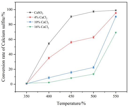 From the figure, it can also be observed that in the two sets of experiments with CaCl2 content of 10% and 16%, the conversion rate of calcium sulfite was significantly lower, and the change in the conversion rate with temperature was relatively slow between 300 °C and 500 °C, followed by a sharp increase when the temperature exceeded 500 °C. This might have been due to the fact that 500 °C was an interface temperature, beyond which CaCl2 began to decompose. This observation provides valuable guidance for companies dealing with desulfurization ash containing more than 10% CaCl2. As shown in the figure, when the reaction temperature reached 550 °C, chloride had minimal effect on the conversion rate of calcium sulfite. This finding serves as a crucial guide for the design of the desulfurization ash oxidation process, and the temperature of 550 °C can be considered a significant interface temperature.
