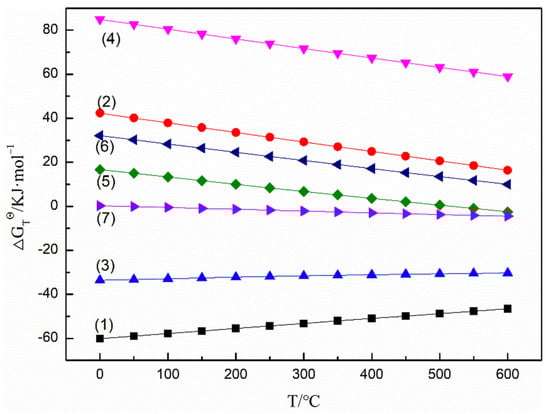 The reaction equations involved in this experiment are listed below. By calculating the Gibbs free energies at different temperatures using the HSC 6.0 software, it was found that only Equations (1), (3) and (7) proceeded spontaneously below 600 °C.