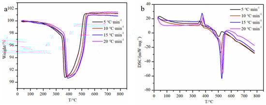 In order to study the oxidation mechanism of CaSO3, analytically pure CaSO3 was raised to 800 °C in air at four different heating rates, and the TG and DSC data plots of the reaction were obtained after treatment, as shown in Figure 7.