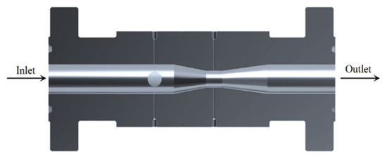 To comply with confidentiality requirements, the pertinent structural parameters of the solid–liquid two-phase flowmeter cannot be disclosed. The computational domain is established by SolidWorks 2010 3D modeling software, which includes the inlet straight section, tapered section, throat, expanding section, and the outlet straight section. Refer to Figure 1 for the profile of the solid–liquid two-phase flowmeter computational domain model.