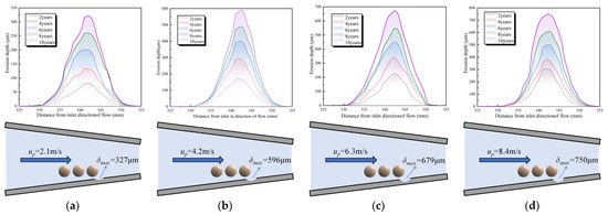 Erosion depth for different particle inflow velocities over time. (a) up = 2.1 m/s; (b) up = 4.2 m/s; (c) up = 6.3 m/s; (d) up = 8.4 m/s.