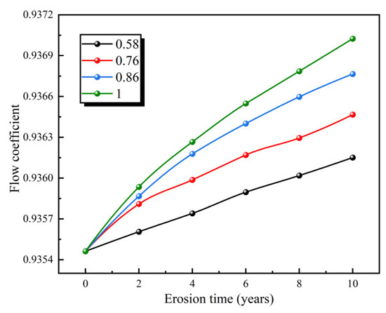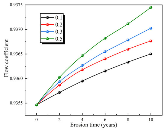 In Figure 6, when the particle inflow velocity is less than 2.1 m/s, the flow coefficient increases from 0.9355 initially to 0.9363 over 10 years, reflecting a marginal rise of 8 × 10−4 with prolonged erosion time. Nevertheless, when the particle inflow velocity falls within the range of 4.2~8.4 m/s, the flow coefficient rises in conjunction with both erosion time and particle inflow velocity. The increase in the flow coefficient ranges from 1.56 × 10−3 to 1.97 × 10−3 over a span of 10 years. The flow coefficient shows a tendency to increase with both erosion time and an increase in particle inflow velocity.