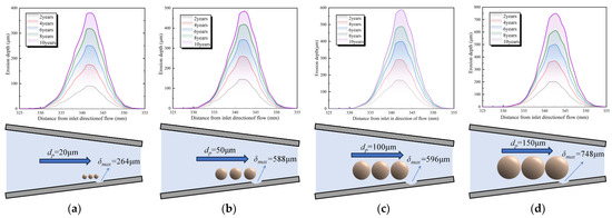 Erosion depth for different particle diameters over time. (a) dp = 20 μm; (b) dp = 50 μm; (c) dp = 100 μm; (d) dp = 150 μm.