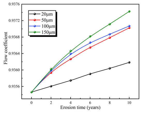 In Figure 10, when the particle diameter is 20 μm, the increase in the flow coefficient is the smallest over the course of erosion time, with a gain of 2.644 × 10−2 over 10 years. For particle diameters in the range of 50~100 μm, the flow coefficient increases with larger increments, specifically 3.156 × 10−2 and 3.161 × 10−2, respectively. The most substantial increase in the flow coefficient occurs when the particle diameter is 150 μm, reaching a maximum increment of 3.196 × 10−2.