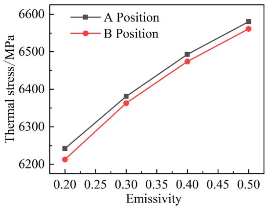 6.2. Effect of the Emissivity of the Inner Wall Material of the Solar Reactor on Thermal Stress