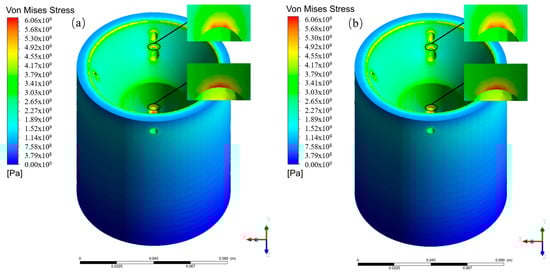 The simulation results are compared with the literature. (a) Von Mises stress simulation results; (b) experimental results in the literature. (A: the inlet opening, B: the front thermocouple opening, C: aperture, D: the lighting opening).