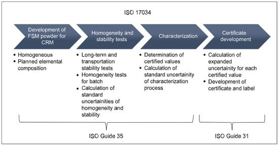The general process scheme is presented in Figure 1. While the general approach was determined by ISO 17034 [20], the individual stages had experimental and research characteristics. Because the reference materials for the FSM alloy were produced for the first time, it was necessary to develop a methodology to obtain a homogeneous material with a specified elemental composition. Furthermore, in subsequent stages, it was necessary to develop analytical methods that meet specific criteria. The technical and statistical approach to the process was carried out in accordance with ISO Guide 35 [24], while the documentation formats were developed in compliance with ISO Guide 31 [25].