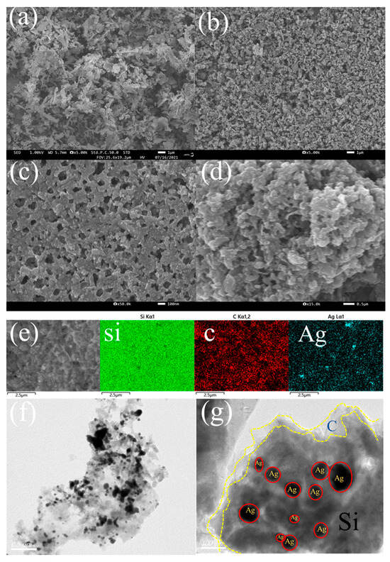 SEM image of KL Si (a), Si NPs (b), pSi/Ag (c) and pSi/Ag@C (d); elemental mapping of pSi/Ag@C (e); (f,g) TEM image of pSi/Ag@C.