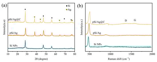 (a) XRD patterns; (b) Raman spectrum of Si NPs, pSi/Ag and pSi/Ag@C.