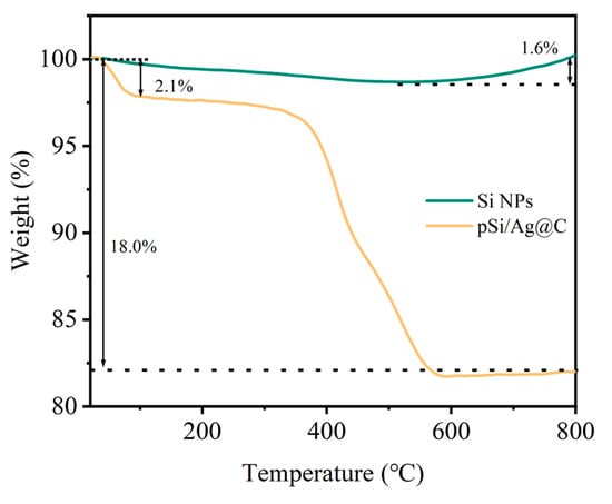 The determination of the carbon content of pSi/Ag@C composite was carried out using TG operated in the air atmosphere, and the obtained TG plots are presented in Figure 5. The pSi/Ag@C sample has two main weight loss events. The first weight loss, about 2.1 wt% below 100 °C, is assigned to the desorption of physically adsorbed H2O. The second weight loss, occurring in the temperature range of 300–600 °C, is mainly assigned to the oxidation of carbon, which is approximately 15.9 wt%. It should be noted that the oxidation of silicon at temperatures above 550 °C leads to a slight increase in weight (1.6 wt%), as shown in the TG plot of Si NPs. Therefore, the carbon content of pSi/Ag@C was evaluated to be 14.6 wt%, which has been corrected in consideration of the oxidation of silicon (approximately 80 wt% in pSi/Ag@C composite).