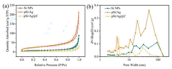 (a) N2 adsorption−desorption isotherms; (b) BJH pore size distribution of Si NPs, pSi/Ag and pSi/Ag@C.