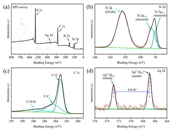 XPS analysis of pSi/Ag@C composite (Figure 7a) reveals characteristic peaks for Si 2p, C 1s, O 1s and Ag 3d in the survey scanning spectrum. In the high-resolution Si 2p spectrum (Figure 7b), the peaks at 98.1 and 98.6 eV correspond to Si 2p3/2 and Si 2p2/1, and the peak at 102.4 eV corresponds to the Si-O-Si bond of SiOx [40]. The strong Si-O-Si peak is due to the oxidation of Si, which may have occurred during wet ball milling of KL Si waste. The further oxidization of Si particle is very slow and difficult due to the restricted O diffusion though the amorphous oxide layer [41]. The generated oxide layer enhances the electrode’s cyclic stability by limiting the volume expansion of Si [42]. In Figure 7d, the C 1s spectrum can be deconvoluted into peaks of C-O-Si (288.1 eV), C-C (284.5 eV) and C=C (283.1 eV), respectively [42]. The Ag 3d spectrum (Figure 7c) exhibits two peaks with a spacing of 6 eV, located at 366.9 eV and 372.9 eV corresponding to Ag0 3d5/2 and Ag0 3d3/2, respectively, demonstrating the high crystallization of Ag0 [43].