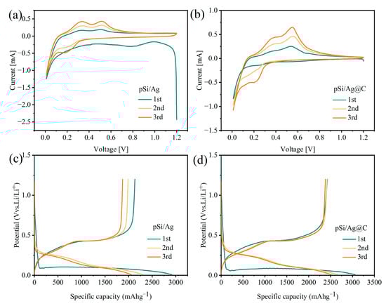 CV curves for the premier three cycles of (a) pSi/Ag electrode and (b) pSi/Ag@C electrode; GCD curves for the premier three cycles at 0.1 A g−1 of (c) pSi/Ag electrode and (d) pSi/Ag@C electrode.