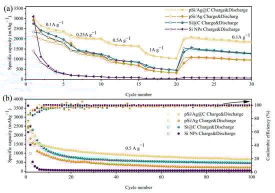 GCD curves of pSi/Ag and pSi/Ag@C electrodes for the first three cycles under 0.1 A g−1 presented in Figure 8c,d, respectively. Both of them show charging plateaus (0.2–0.5 V) and discharging plateaus (0.25–0.01 V). The initial discharge/charge capacities of the pSi/Ag and pSi/Ag@C electrodes 2912.1/2132.6 and 3058.5/2426.1 mAh g−1, respectively, with corresponding initial coulombic efficiencies (ICE) of 73.2% and 79.3%. The coulombic efficiencies (CE) of the second and third cycle for pSi/Ag@C electrodes is 90.1% and 94.5%, respectively. The pSi/Ag@C electrode generates a stable SEI film more quickly during charge–discharge cycles, indicating its better performance regarding Li+ reversible storage.