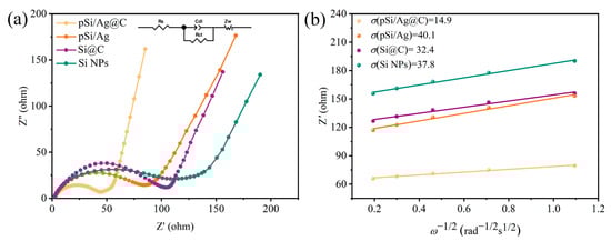 Figure 10a displays EIS curves of the pristine electrodes. Analysis reveals that the high-frequency semicircle signifies charge-transfer resistance (Rct), and the straight line at low-frequency indicates electrolyte resistance (Rs) [55]. Using an equivalent circuit model, the Rct value of pSi/Ag@C (44.3 Ω), pSi/Ag (85.6 Ω) and Si@C (104.4 Ω) is determined to be significantly lower than that of Si NPs (115.3 Ω). This demonstrates notably enhanced charge transfer kinetics for the pSi/Ag@C, pSi/Ag and Si@C electrode. pSi/Ag@C has the smallest Rct value, mainly due to the introduction of Ag nanoparticles and the porous structure, indicating higher lithium-ion transfer rate. The diffusion coefficient of Li+ can be evaluated by the following Equations (1) and (2) [56]: