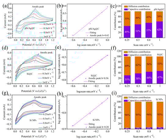 The electrochemical kinetic of the presented electrodes was further studied by measuring the CV curves at different scan rates from 0.25 to 1 mV s−1. The results can be viewed in Figure 11a, Figure 11d and Figure 11g for the pSi/Ag@C, Si@C, and Si NP electrode, respectively. The CV curves of the pSi/Ag@C electrode show similar oxidation–reduction peaks, indicating excellent reversibility. The relationship between peak current (i) and scan rate (v) is typically described by i = avb, where a and b are adjustable parameters. The b is 0.5 indicates that Li+ ion storage is primarily controlled by diffusion, while a b value of 1 implies predominantly capacitive behavior [57]. The line fittings of log(i) and log(v) are presented in Figure 11b, e and h to calculate the b values, where the pSi/Ag@C, Si@C, and Si NP electrode has a b value of 0.62, 0.56 and 0.28, respectively. The calculated results suggest that the electrochemical reaction kinetics of the pSi/Ag@C electrode are jointly controlled by pseudocapacitance and diffusion reactions. Moreover, the percentage of capacitive and diffusion contribution is determined by Equation (3):